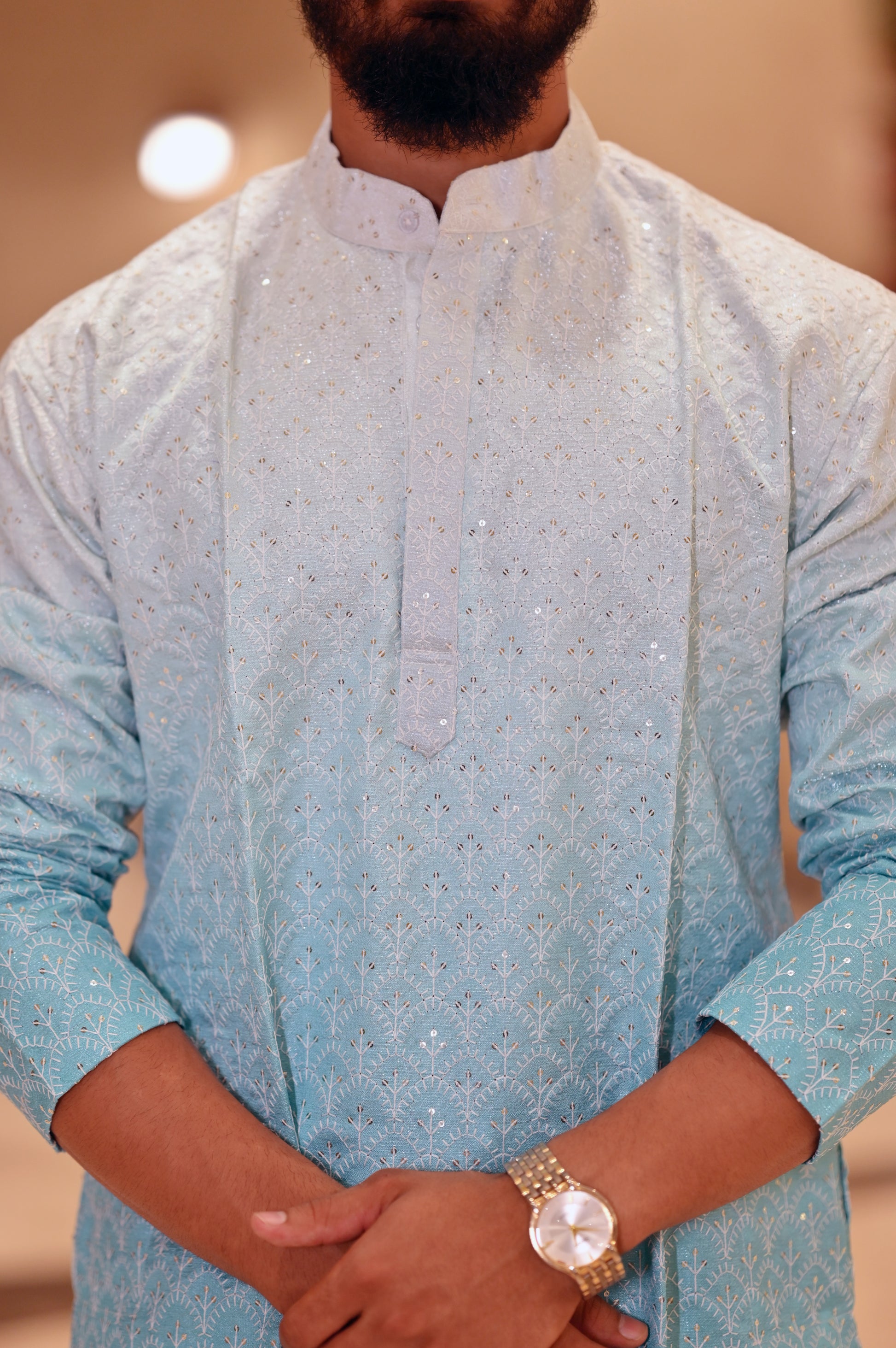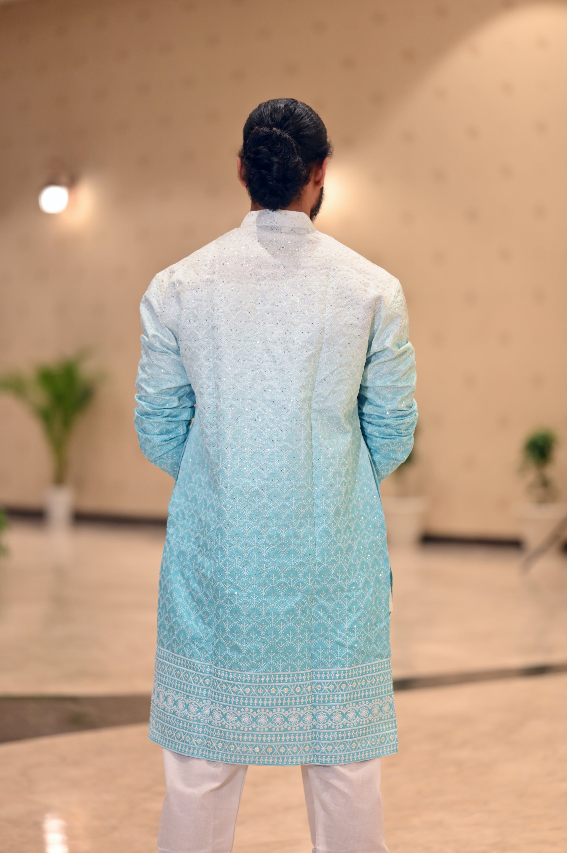 Elegant Sky Blue Ombre Embroidered Kurta for Men – Festive & Traditional Wear