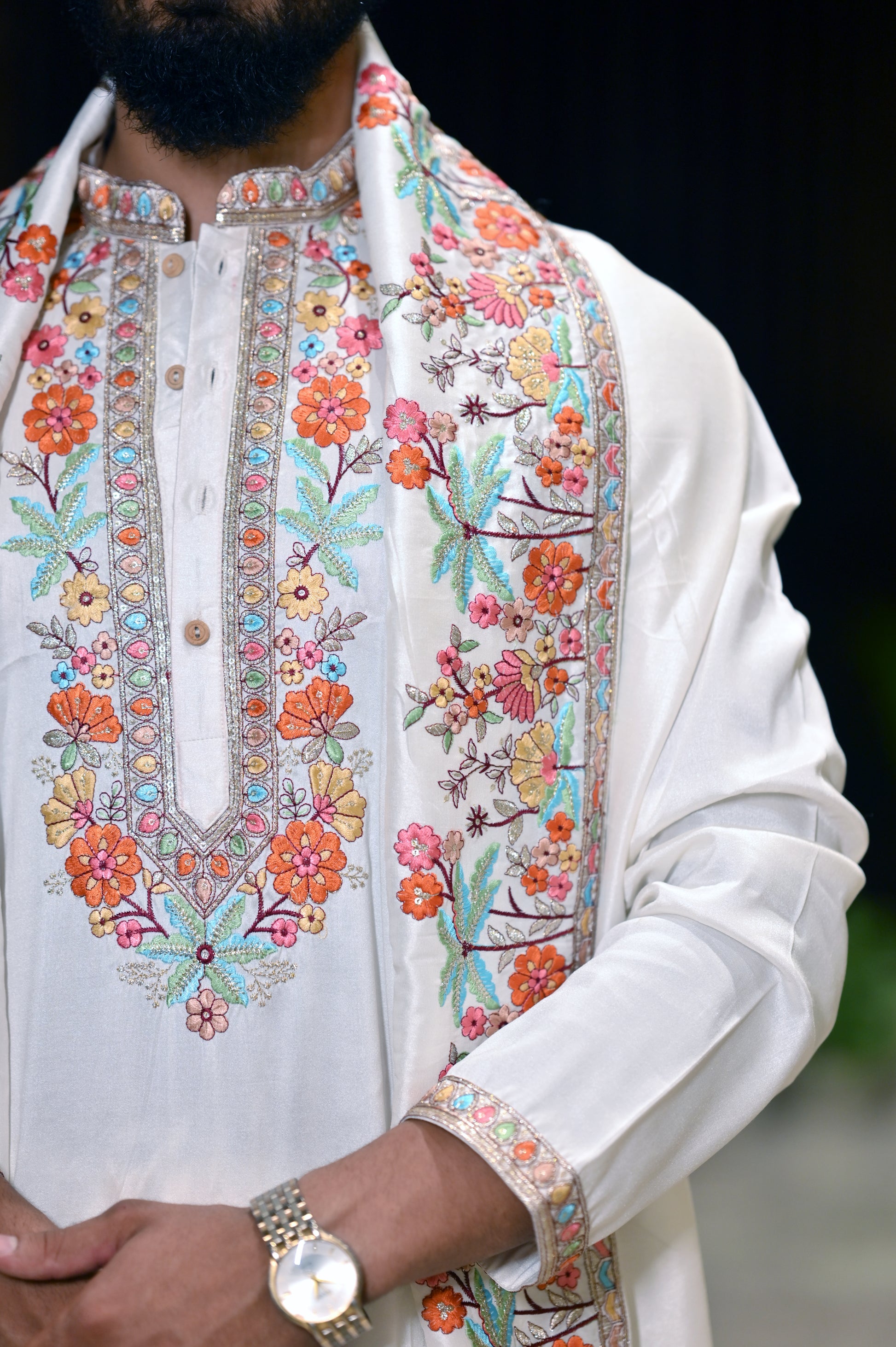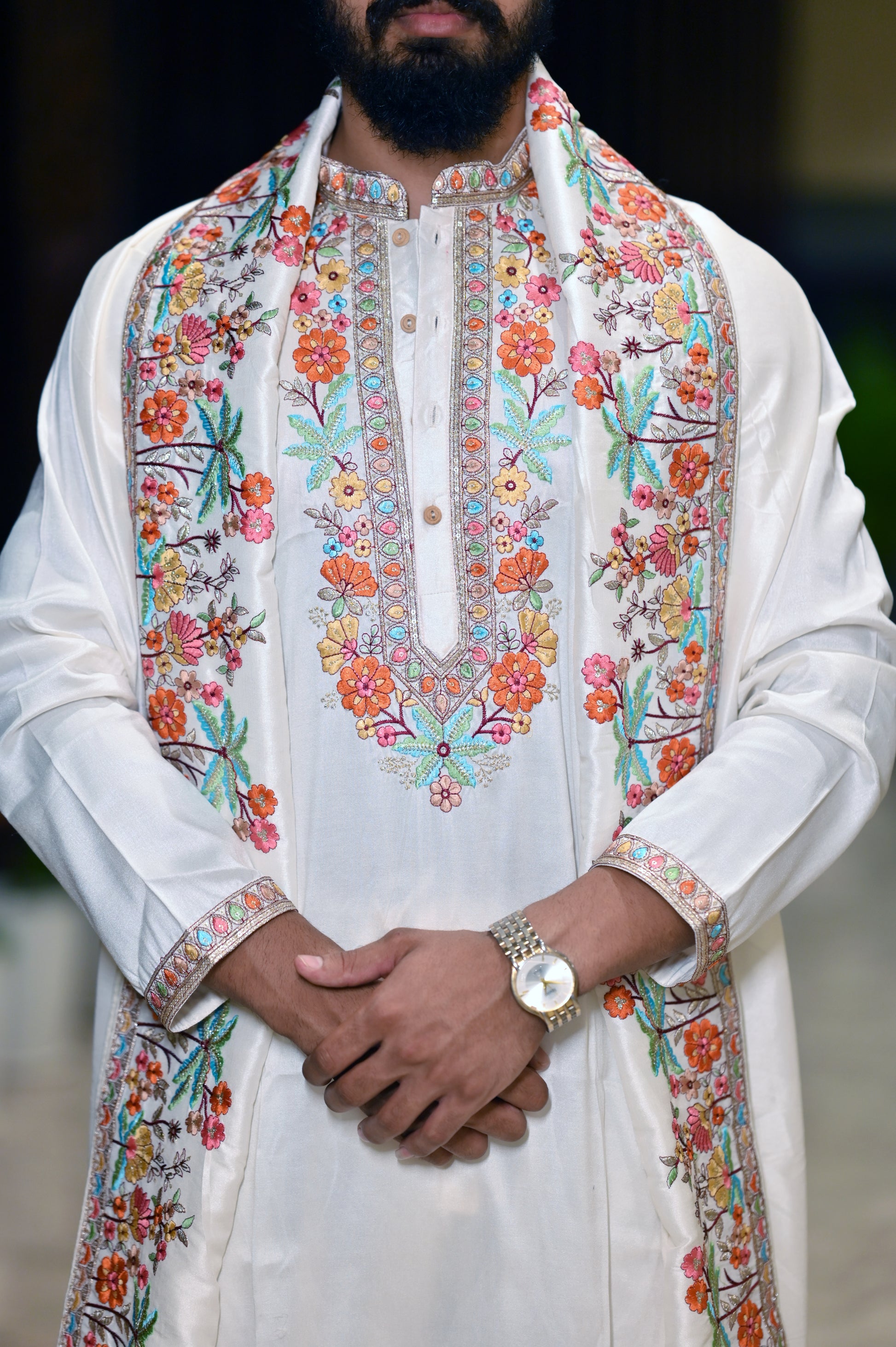 Men’s Embroidered Off-White Kurta with Dupatta - Premium Kaju Silk Fabric